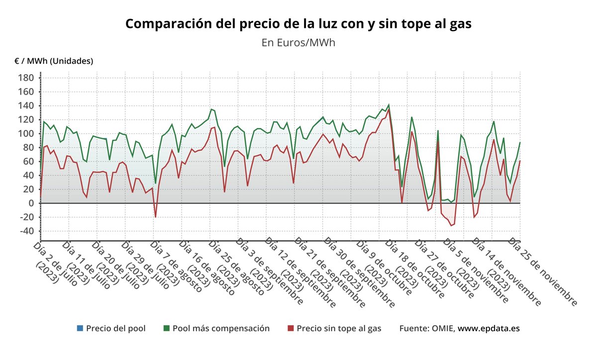 En lo que va de mes de noviembre, el 'pool' eléctrico registra un precio superior a los 61,5 euros/MWh, frente a los 115 euros/MWh que registró en noviembre de 2022.