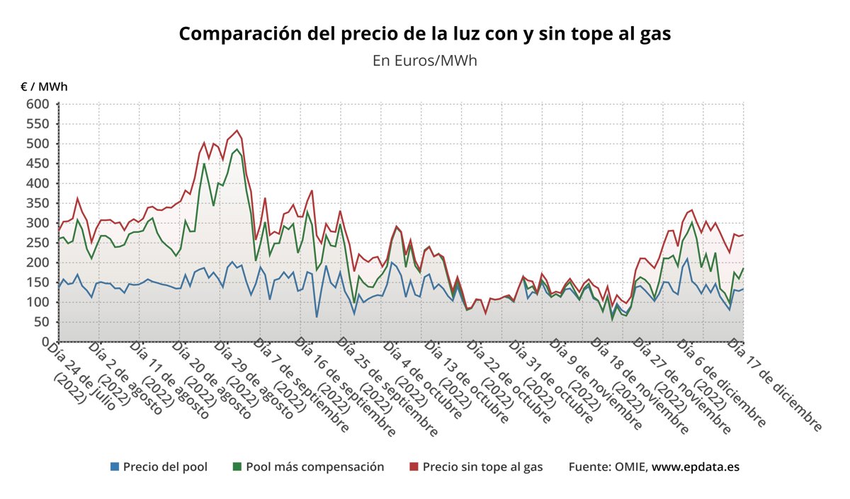 En ausencia del mecanismo de la 'excepción ibérica' para topar el precio del gas para la generación de electricidad, el precio de la electricidad en España sería de media unos 270,37 euros/MWh, lo que supone unos 83,64 euros/MWh más que con la compensación para los clientes de la tarifa regulada, que pagarán así un 30,9% menos de media.