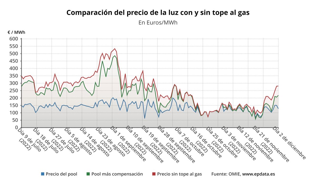 En ausencia del mecanismo de la 'excepción ibérica' para topar el precio del gas para la generación de electricidad, el precio de la electricidad en España sería de media unos 281,06 euros/MWh, lo que supone unos 62,87 euros/MWh más que con la compensación para los clientes de la tarifa regulada, que pagarán así un 22,36% menos de media.