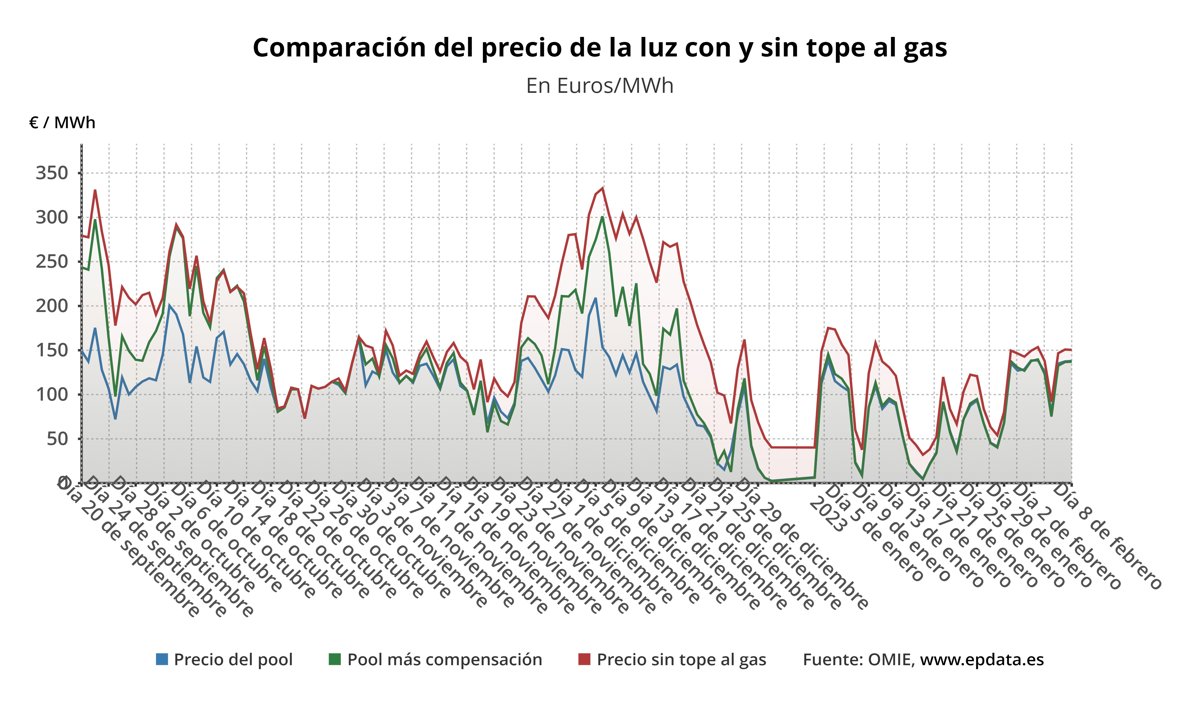 En ausencia del mecanismo de la 'excepción ibérica' para topar el precio del gas para la generación de electricidad, el precio de la luz en España sería de media de unos 150,44 euros/MWh, lo que supone 13,3 euros/MWh más que con la compensación para los clientes de la tarifa regulada, que pagarán así un 8,84% menos de media.