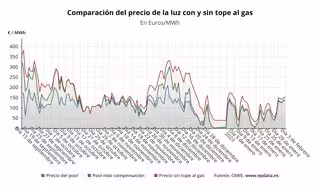En ausencia del mecanismo de la 'excepción ibérica' para topar el precio del gas para la generación de electricidad, el precio de la luz en España sería de media de unos 153,62 euros/MWh, lo que supone 14,76 euros/MWh más que con la compensación para los clientes de la tarifa regulada, que pagarán así un 9,61% menos de media.