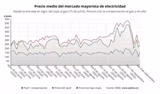 De esta manera, y a pesar de que el precio sigue siendo elevado, se mantiene lejos de los niveles máximos de la semana pasada, cuando el miércoles llegó a alcanzar los 486,21 euros/MWh de media, el valor más alto desde la entrada en vigor de la 'excepción ibérica' y el segundo precio más alto de la historia para los clientes de tarifa regulada vinculados al mercado mayorista, solo por detrás del récord de 544,98 euros/MWh registrado el pasado 8 de marzo, antes de la aplicación del 'tope al gas'.