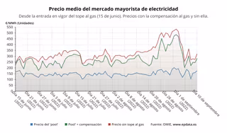 En ausencia del mecanismo de la 'excepción ibérica' para topar el precio del gas para la generación de electricidad, el precio de la electricidad en España sería de media unos 323 euros/MWh, lo que supone unos 40,09 euros/MWh más que con la compensación para los clientes de la tarifa regulada, que pagarán así un 12,41% menos de media.