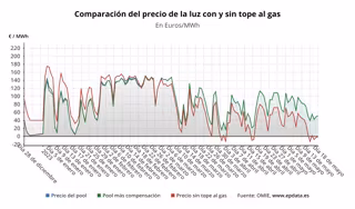 A este precio medio del 'pool' se sumaría la compensación a las gasistas, que tiene que ser abonada por los consumidores beneficiarios de la medida, los consumidores de la tarifa regulada (PVPC) o los que, a pesar de estar en el mercado libre, tienen una tarifa indexada, pero para este jueves se situará nuevamente en 0 euros/MWh, situación que se repite desde el pasado 27 de febrero.