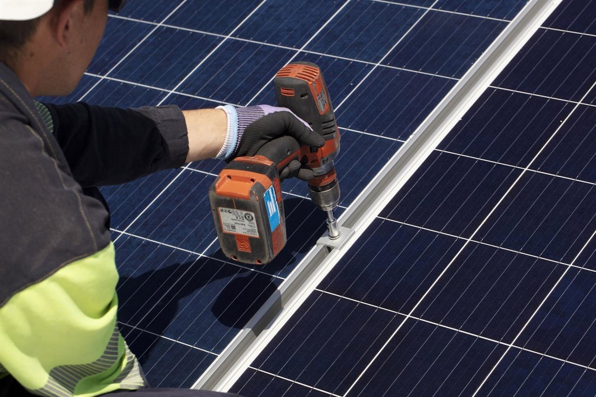 Archivo - Un técnico fija los soportes de una instalación fotovoltaica de autoconsumo de EDP - DANIEL MORA - Archivo