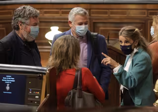 Archivo - (I-D) El diputado de Unidas Podemos, Juan Antonio López de Uralde, conversa con la vicepresidenta para la Transición Ecológica y el Reto Demográfico, Teresa Ribera, y la vicepresidenta de Trabajo, Yolanda Díaz - Eduardo Parra - Europa Press - Archivo
