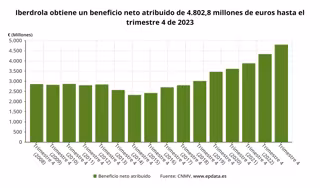 Iberdrola obtuvo un beneficio neto de 4.803 millones de euros en el año 2023, lo que representa un incremento del 10,7% con respecto al ejercicio anterior y pulverizar así sus ganancias récord de 4.339 millones de euros de hace un año, informó la compañía.