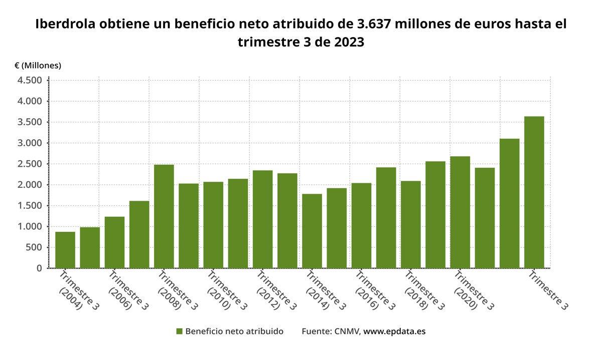 Iberdrola registró un beneficio neto de 3.637 millones de euros en los nueve primeros meses del año, lo que representa un incremento del 17,2% con respecto al mismo periodo del ejercicio pasado -un 22,4% excluyendo el extraordinario derivado de la venta de parte del negocio en México-, informó la compañía.