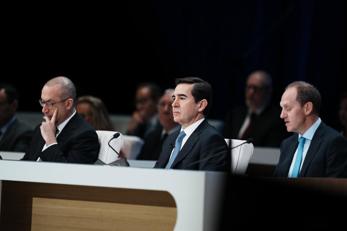 (I-D) El CEO de BBVA, Onur Genç, el presidente de BBVA, Carlos Torres Vila, y el secretario general y del Consejo de Administración de BBVA, Domingo Armengol, durante una Junta General de Accionistas del BBVA, en el Palacio de Euskalduna de Bilbao, a 15 d - H.Bilbao - Europa Press