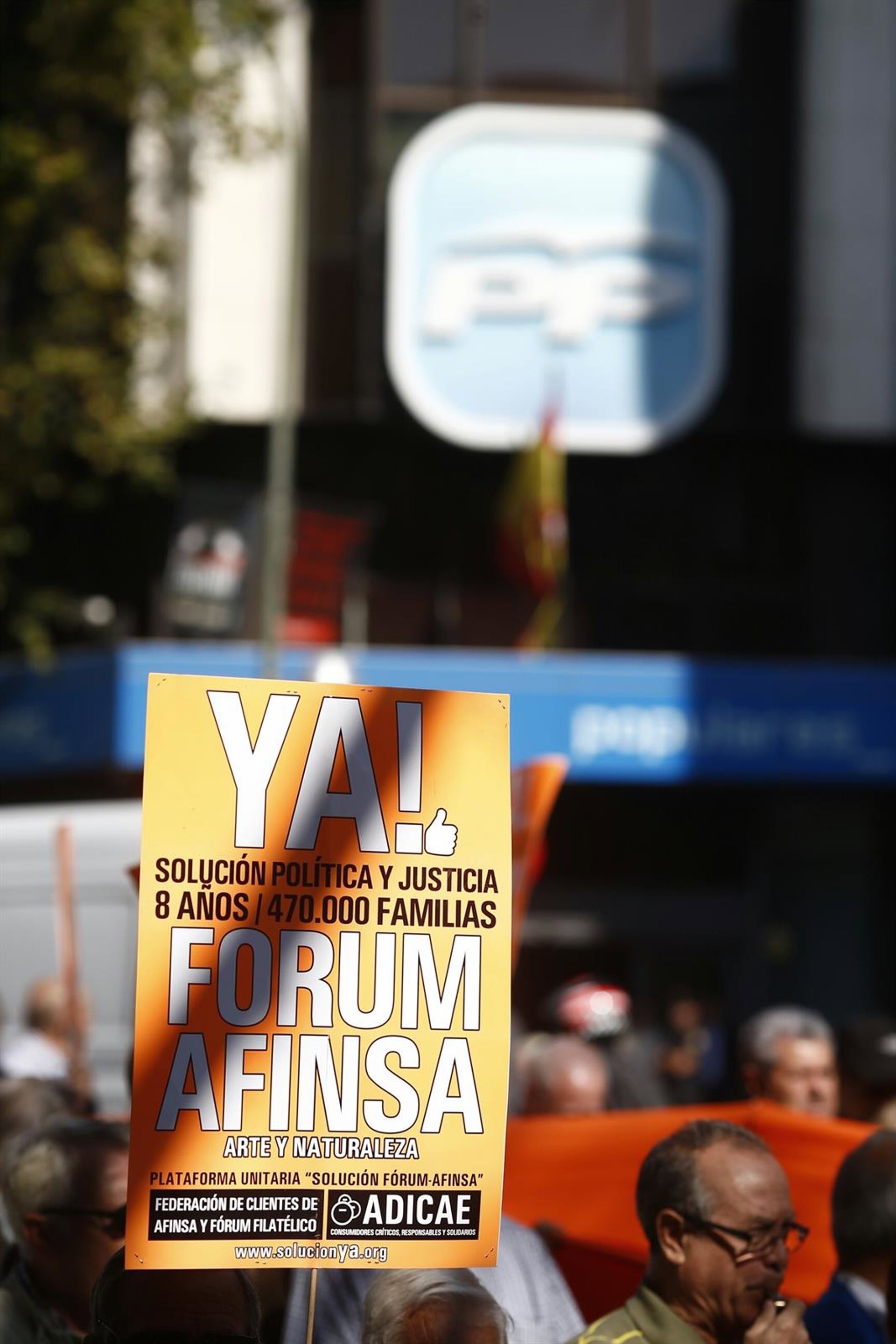 Afectados por la intervención de Fórum Filatélico y Afinsa se han manifestado este miércoles en la calle Génova de Madrid, frente a la sede del PP, para reclamar "una solución política-económica" y exigir la "mediación" del presidente del Gobierno, Mariano Rajoy, en virtud del compromiso, sostienen, adquirido con ellos antes de su llegada a La Moncloa en 2011.