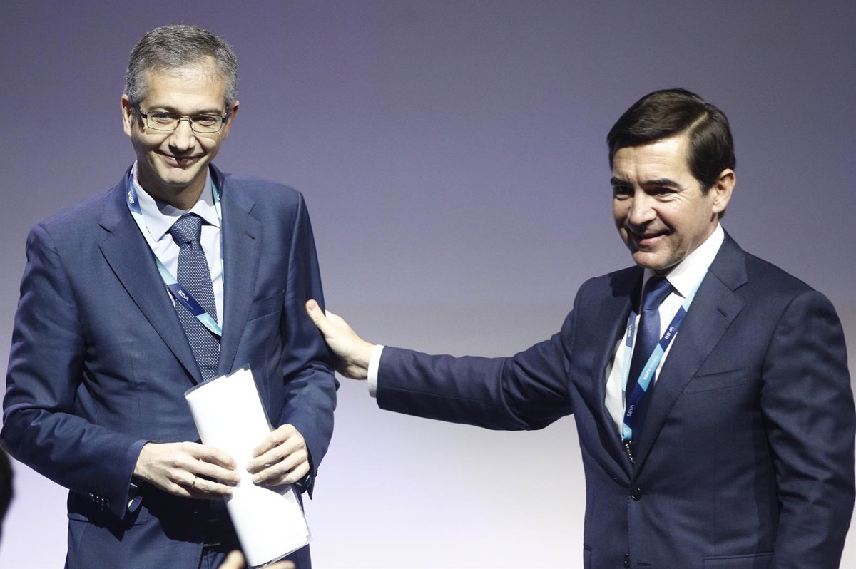 (I-D) El gobernador del Banco de España, Pablo Hernández de Cos y el presidente del BBVA, Carlos Torre Vila, durante el encuentro Edufin Summit 2019: 'Digitalización y educación financiera, una nueva era para cubrir oportunidades' organizado por BBVA. - Eduardo Parra - Europa Press