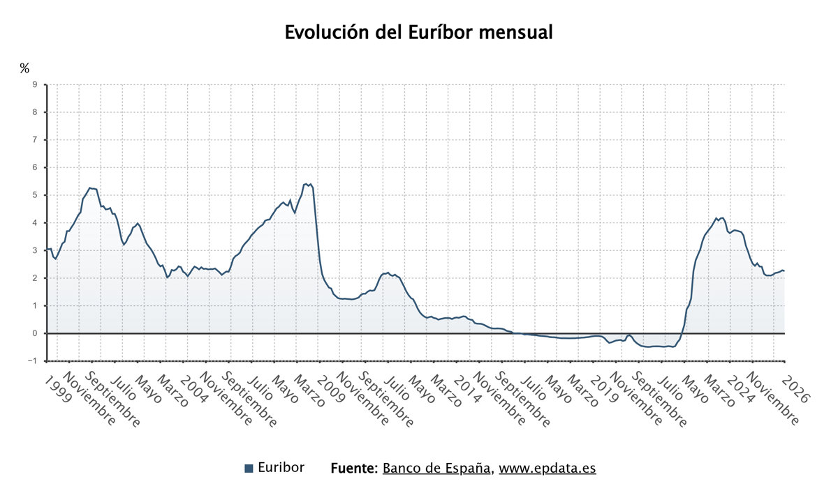 "Este ligero ajuste del Euríbor entre diciembre de 2025 y enero de 2026 refleja que los mercados continúan descontando un escenario de tipos de interés estables por parte del Banco Central Europeo (BCE), con el precio del dinero situado en torno al 2%", prosiguen desde iAhorro.
