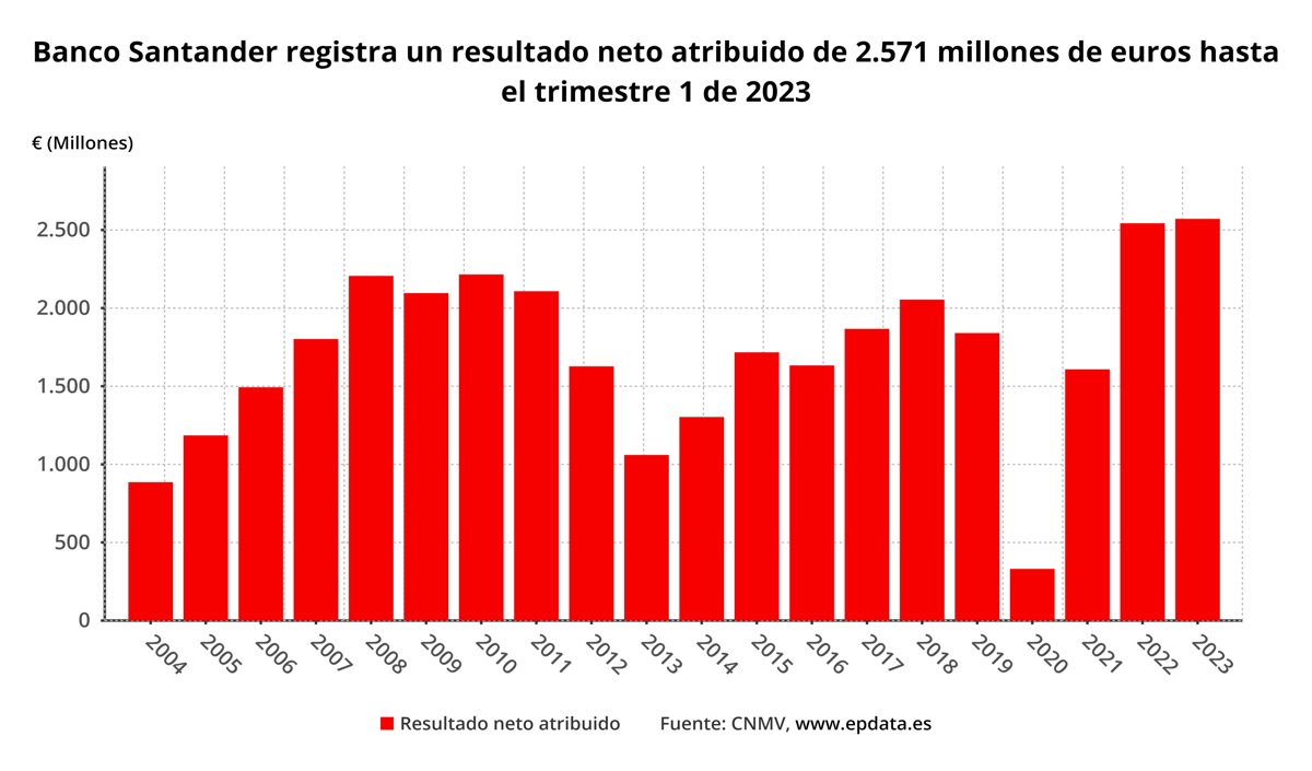 Banco Santander obtuvo un beneficio neto atribuido de 2.571 millones de euros en el primer trimestre de 2023, lo que supone un incremento del 1,1% en comparación con el mismo periodo del año pasado, según ha informado la entidad al publicar su cuenta de resultados trimestral.