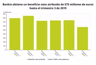 Bankia registró un beneficio neto atribuido de 575 millones de euros en los nueve primeros meses de este año, lo que supone un descenso del 22,6% respecto al mismo periodo de 2018, debido al menor resultado en la venta de las carteras de renta fija (ROF) y al repunte de las provisiones asociadas a la aceleración del ritmo en la reducción de dudosos.