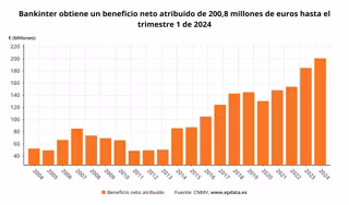Bankinter se anotó un beneficio neto de 200,8 millones de euros en el primer trimestre de 2024, lo que supone un alza del 8,7% respecto de los 185 millones que obtuvo en el mismo periodo de 2023, según se desprende de las cuentas trimestrales que ha publicado el banco este jueves.