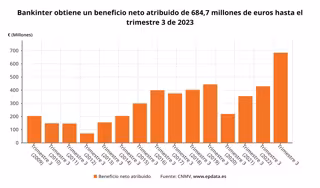 Bankinter cerró los nueve primeros meses de 2023 con un beneficio neto atribuido de 684,7 millones de euros, lo que supone un incremento del 59% respecto al mismo periodo del año anterior, según ha informado este jueves la entidad financiera al publicar su cuenta de resultados trimestral.