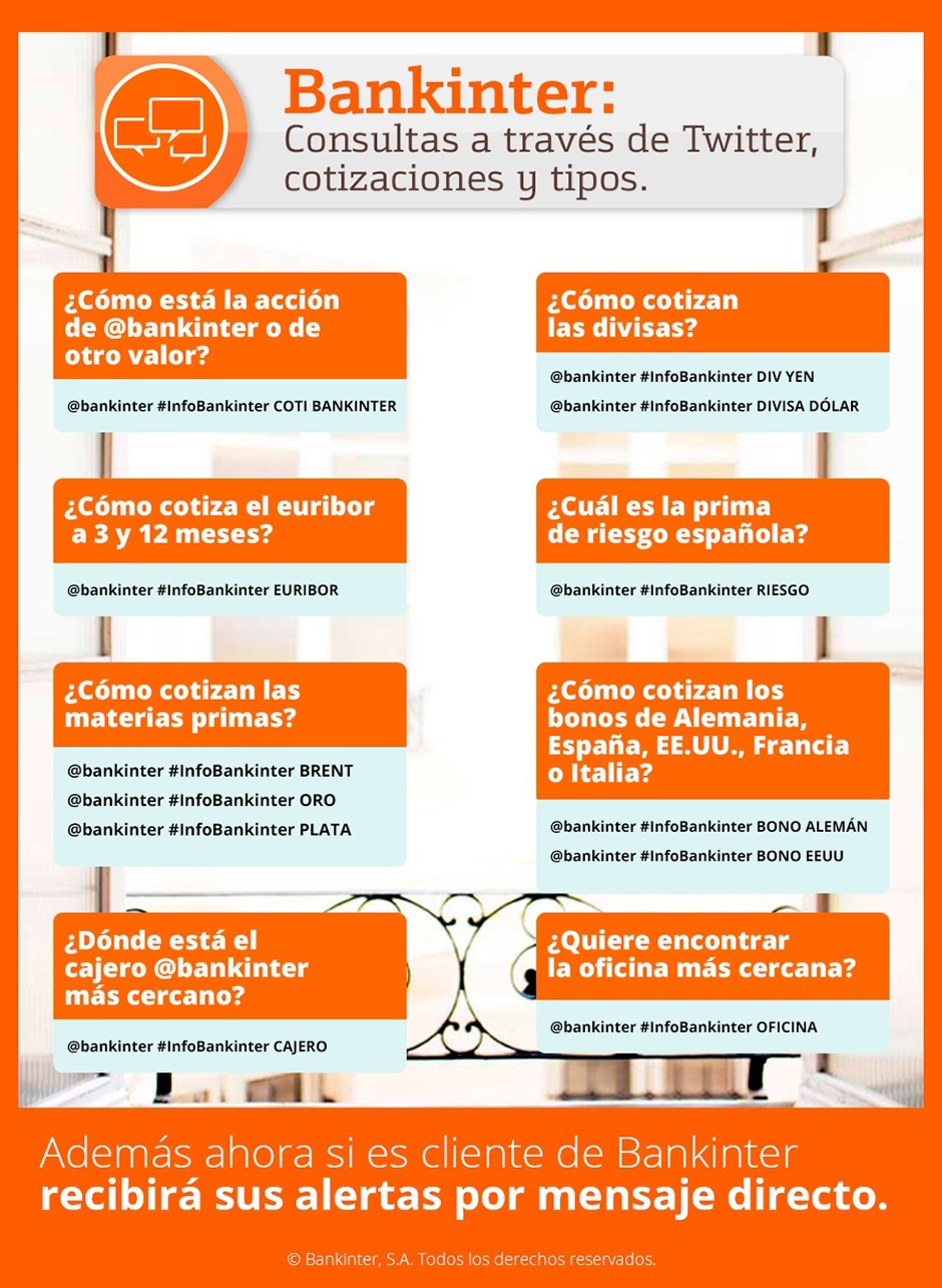 El servicio ya está actualmente disponible y sus condiciones de acceso y operativa se pueden consultar a través de @bankinter o desde la web del banco. El alta, por motivos de seguridad, se debe realizar a través de la página de Bankinter.com (alta en servicio de Twitter para clientes y alta para no clientes)