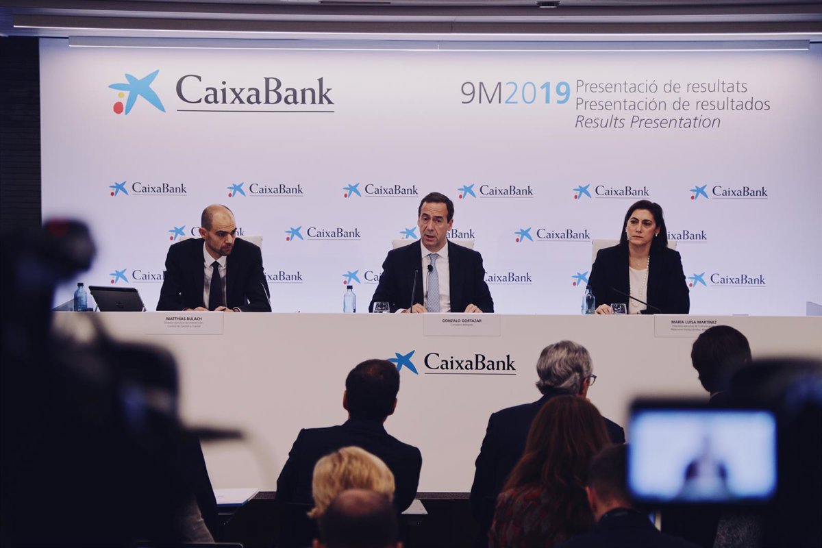 (I-D) El director ejecutivo de Intervención, Control de Gestión y Capital, Matthías Bulach; el consejero delegado de CaixaBank, Gonzalo Cortázar y la directora ejecutiva de Comunicación, Relaciones Internacionales, Marca y RSC, María Luisa Martínez en r - Enrique Palomares - Europa Press