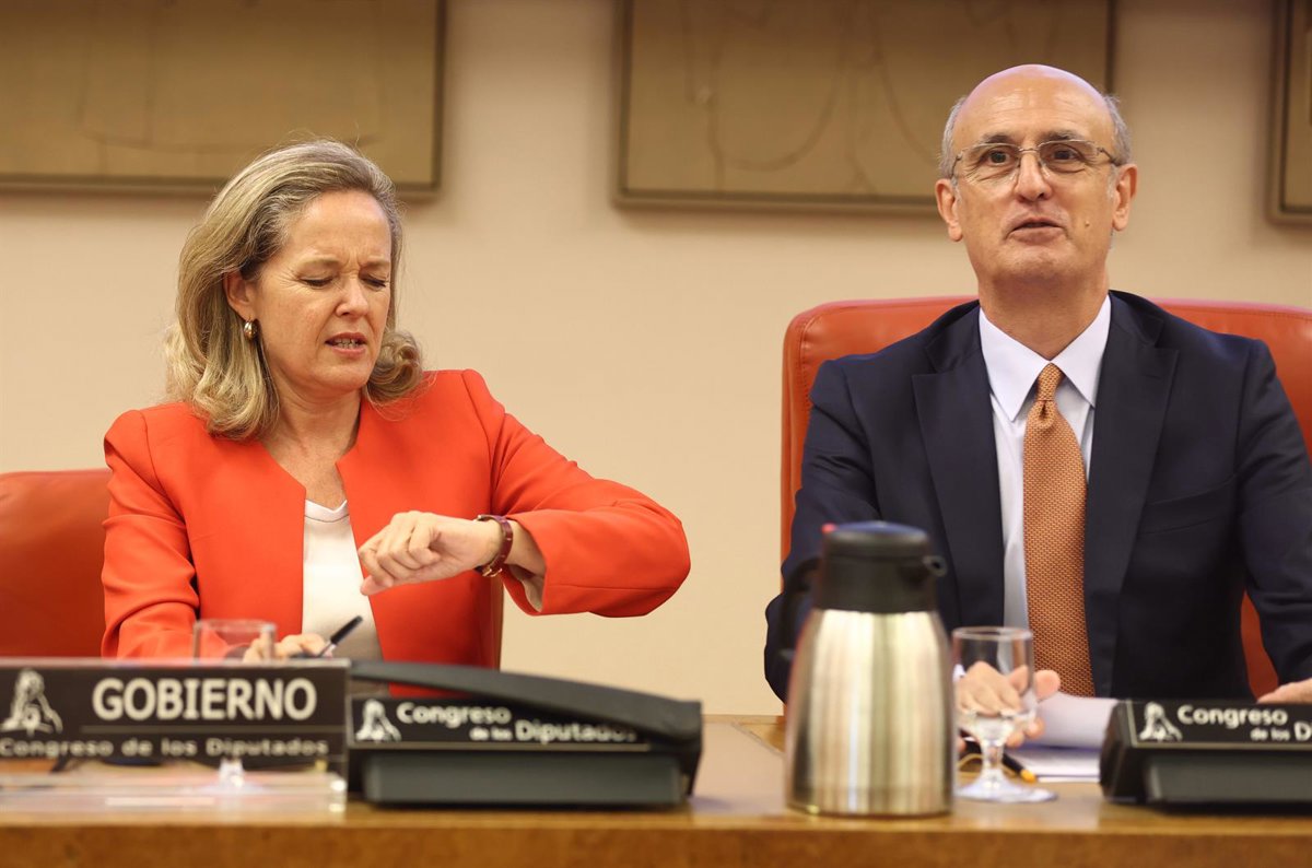 La vicepresidenta primera del Gobierno y ministra de Asuntos Económicos y Transformación Digital, Nadia Calviño, y el presidente de la mesa de la comisión del ramo en el Congreso, Celso Luis Delgado, durante una comparecencia - Eduardo Parra - Europa Press