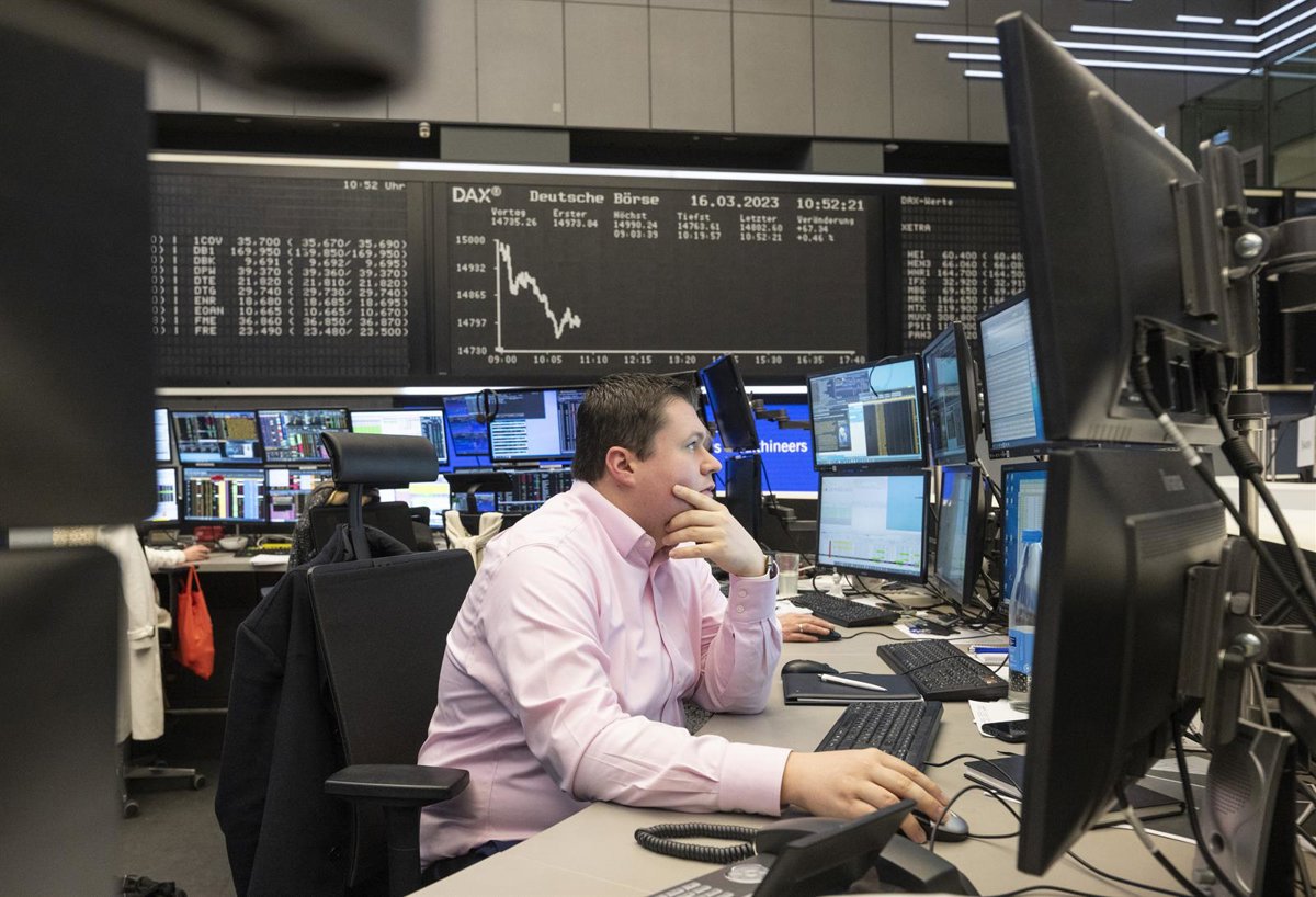 Archivo - 16 March 2023, Hesse, Frankfurt_Main: A stock trader watches the price development on his monitor at Frankfurt Stock Exchange. Following the recent turbulence in the banking sector, financial experts are keeping a close eye on developments on - Boris Roessler/Dpa - Archivo