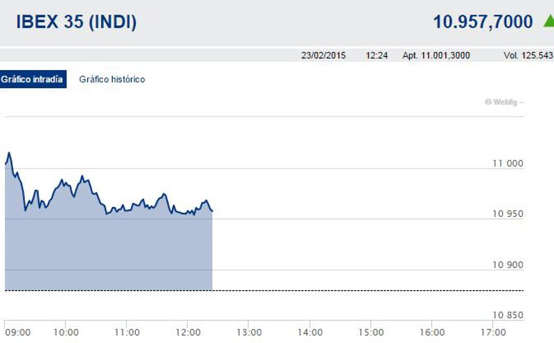 El Ibex 35 avanzaba un 0,82% en la media sesión de este lunes, lo que llevaba al selectivo a coquetear con los 11.000 enteros (10.968) tras el acuerdo alcanzado con Grecia sobre la prórroga de su rescate. En el mercado de deuda, la prima de riesgo se ha colocado en 104,7 puntos básicos, con la rentabilidad del bono a diez años en el 1,432%.