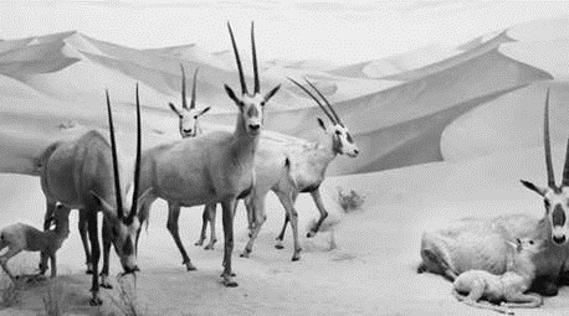 --escenografías tridimensionales-- del Museo de Historia Natural de Los Angeles (EE.UU.): manadas de bueyes almizcleros, órices de Arabia y leones marinos de Steller.