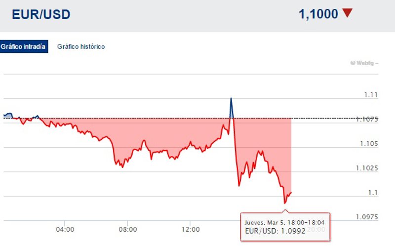 En concreto, las palabras de Draghi han llevado a la moneda común europea, que había comenzado el día en 1,1077 dólares, a caer durante la sesión hasta los 1,0986 'billetes verdes'.