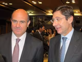 El ministro de Economía, Luis de Guindos, y el presidente de Bankia, José Ignacio Goirigolzarri, han recibido este martes los premios Tintero y Secante, respectivamente, otorgados por la Asociación de Periodistas Económicos (APIE).