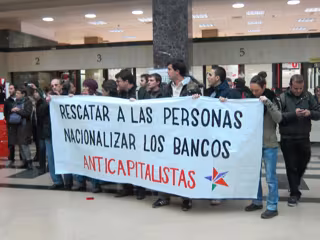 En la sede del Santander, los anticapitalistas han desplegado una pancarta con el lema 'Rescatar a las personas. Nacionalizar los bancos', y han gritado lemas como 'Esta crisis no la pagamos', 'Tu botín, mi crisis', o 'Santander, expropiación'.