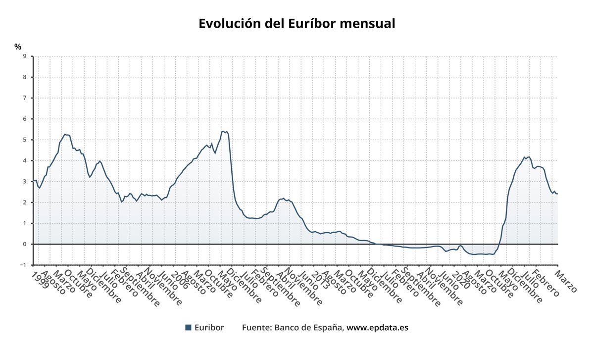 El Euríbor ha cerrado el mes de marzo situado en el 2,398%, lo que supone un descenso de menos de un punto básico en comparación con el 2,407% registrado al cierre del mes de febrero, a falta de confirmación de la tasa de referencia por parte de Banco de España.