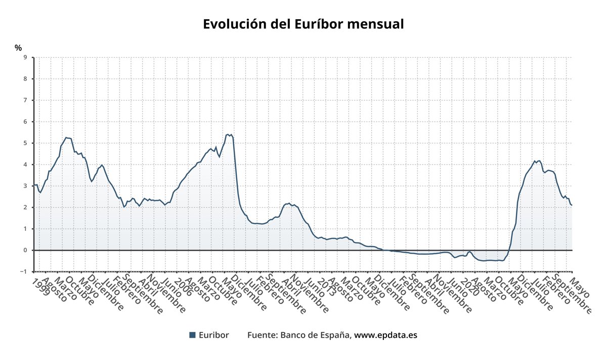 El Euríbor a 12 meses, tasa de interés de referencia del mercado interbancario al que están referenciadas la mayoría de las hipotecas a tipo variable de España, se situó en mayo en el 2,081% de media, a falta de confirmación del dato por parte de Banco de España.
