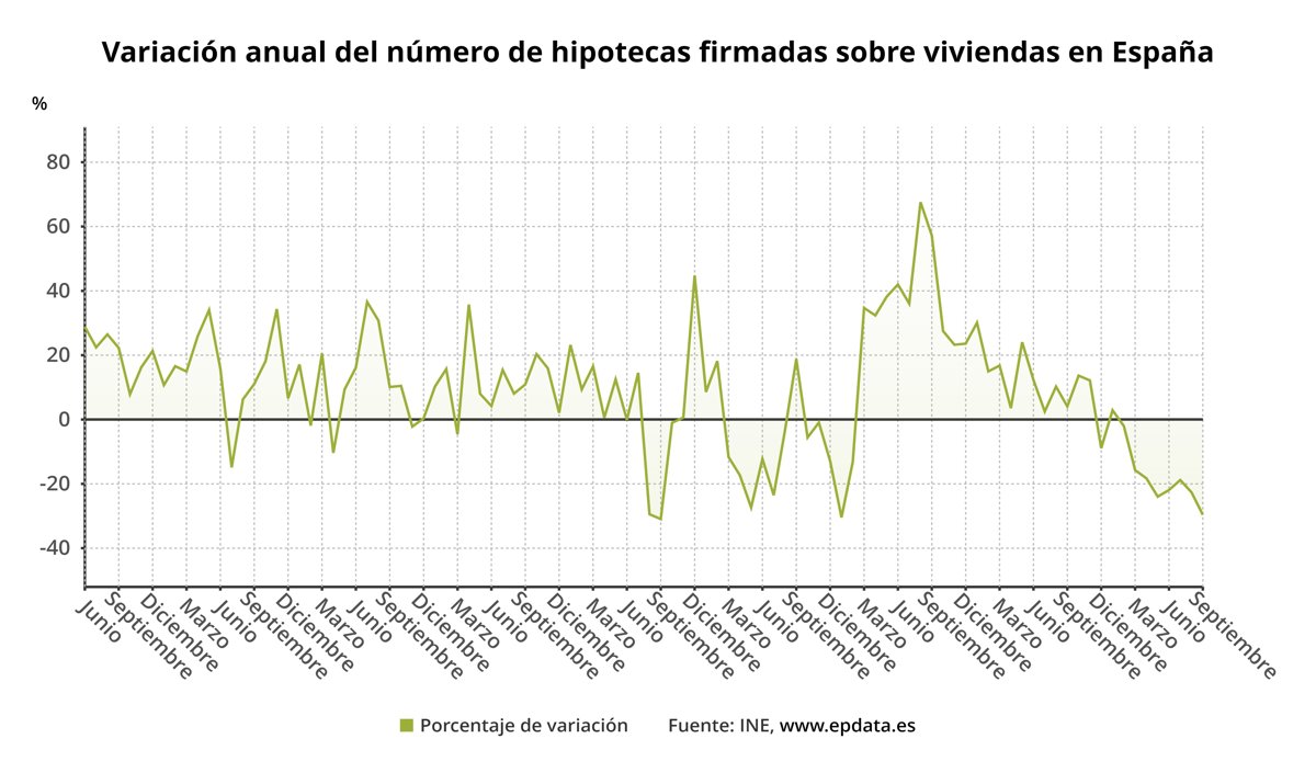 Con el descenso interanual de septiembre, el más pronunciado desde enero de 2021, la firma de hipotecas sobre viviendas encadena ocho meses de tasas negativas, aunque el de septiembre ha sido mayor que el registrado en agosto (-22,7%).