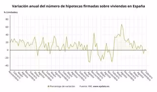 Con el descenso interanual de febrero, la firma de hipotecas sobre viviendas retorna a tasas negativas después de que en enero subiera un 2,9% interanual. Antes de eso, en diciembre de 2022, este indicador registró un descenso interanual del 8,8% tras 21 meses de ascensos interanuales consecutivos.