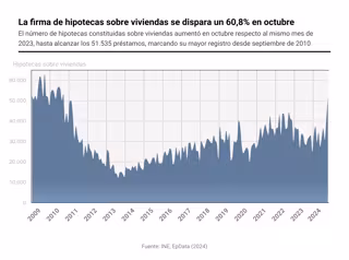 El número de hipotecas constituidas sobre viviendas se disparó un 60,8% en octubre respecto al mismo mes de 2023, hasta sumar 51.535 préstamos, su mayor cifra desde septiembre de 2010, con un tipo de interés medio inferior al del mes anterior, según los datos difundidos este viernes por el Instituto Nacional de Estadística (INE).