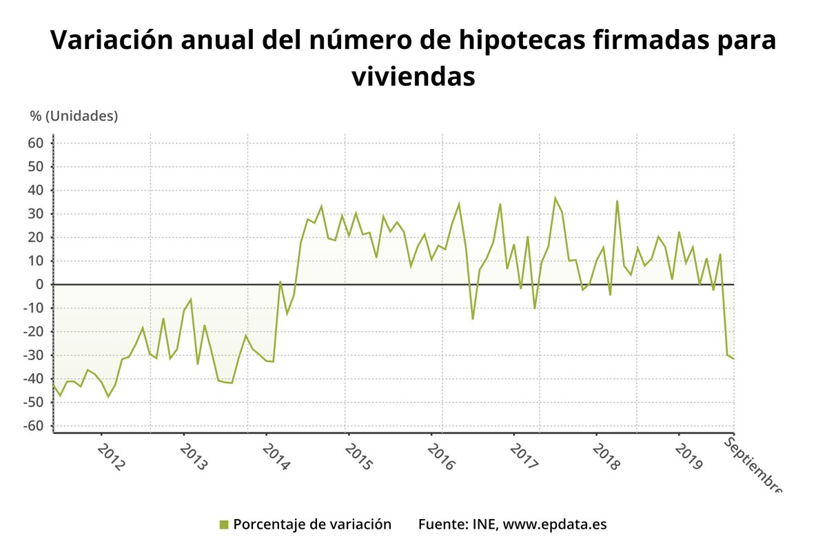 Variación anual del número de hipotecas constituidas sobre viviendas hasta septiembre de 2019 (INE) - EPDATA
