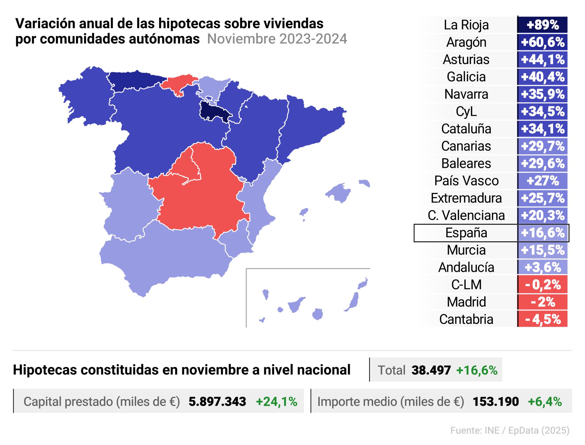 Catorce comunidades firmaron el pasado mes de noviembre más hipotecas sobre viviendas que en el mismo mes de 2023, destacando los avances interanuales de La Rioja (+89%), Aragón (+60,6%), Asturias (+44,1%) y Galicia (+40,4%).