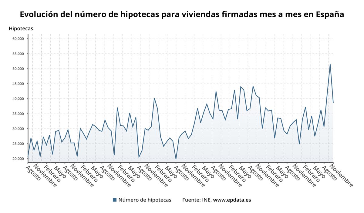 Con el avance interanual de noviembre, mucho más moderado que el de octubre (+60,8%), la firma de hipotecas suma cinco meses consecutivos de alzas.