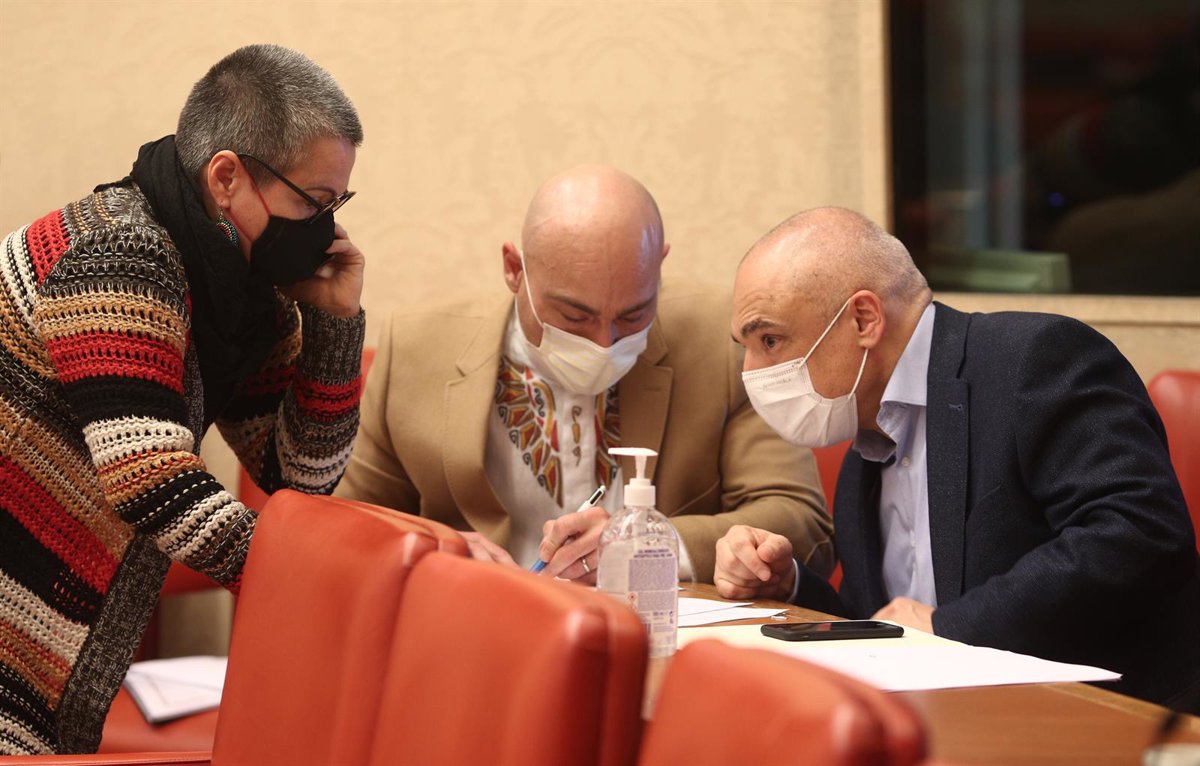 El secretario general del PSOE en el Congreso, Rafael Simancas (d), conversa durante la Comisión de Presupuestos en el Congreso con el portavoz económico de Unidas Podemos, Txema Guijarro, y la diputada de ERC María Carvalho - EUROPA PRESS/E. Parra. POOL - Europa Press