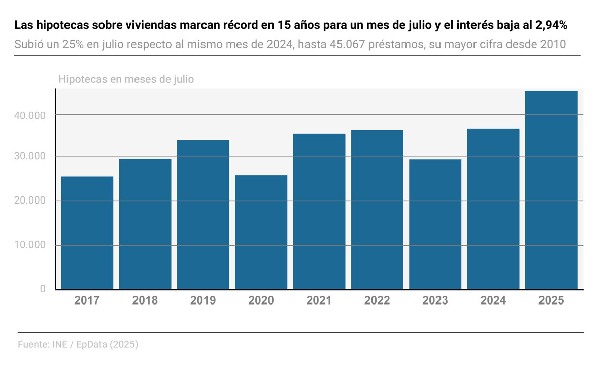 El número de hipotecas constituidas sobre viviendas subió un 25% en julio respecto al mismo mes de 2024, hasta sumar 45.067 préstamos, su mayor cifra en este mes desde el ejercicio 2010, según los datos difundidos este jueves por el Instituto Nacional de Estadística (INE).