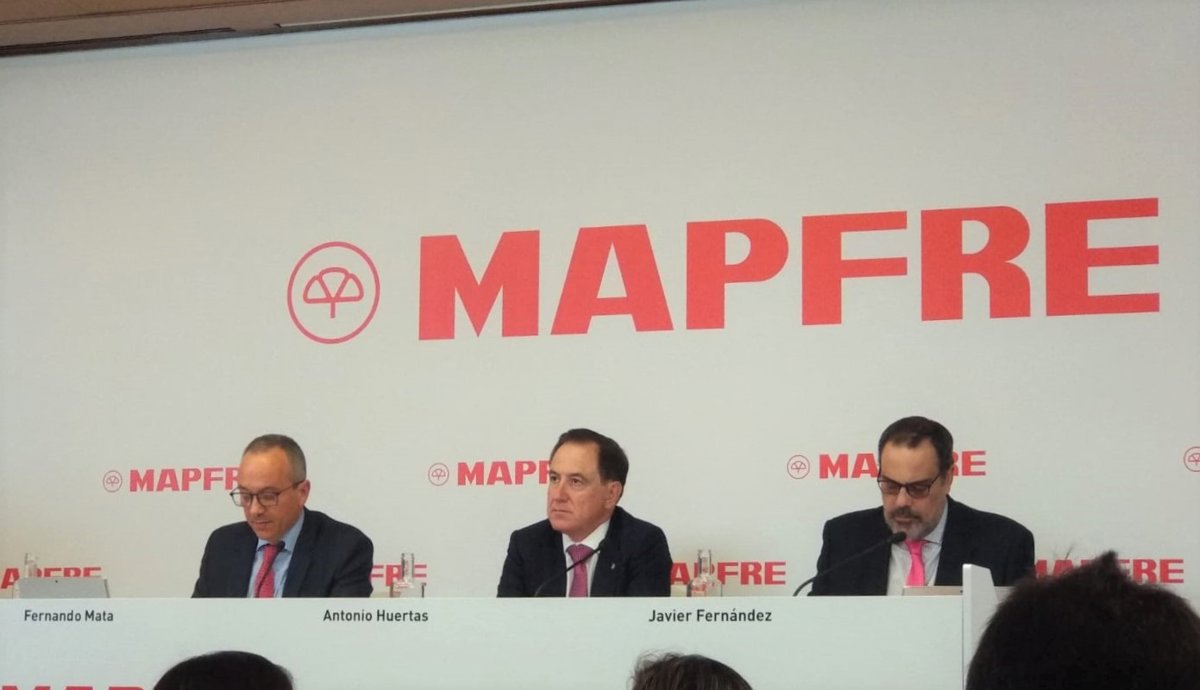 Rueda de prensa de resultados de Mapfre. A la izquierda, el director financiero, Fernando Mata. En el centro, el presidente de la entidad, Antonio Huertas. - EUROPA PRESS