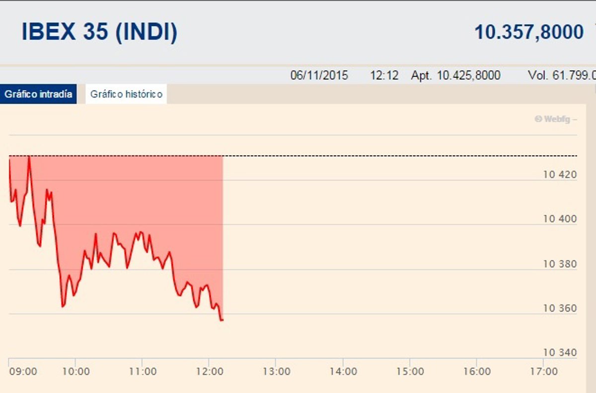 El Ibex 35 ampliaba sus caídas a media sesión y se alejaba de la cota de los 10.400 puntos, arrastrado por los descensos de Inditex y Telefónica.
