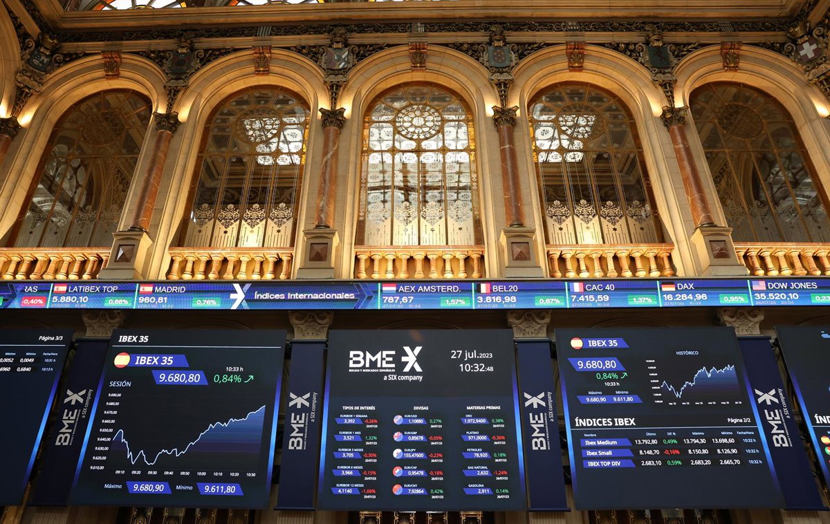 Un panel del Ibex 35 en el Palacio de la Bolsa, a 27 de julio de 2023, en Madrid (España). El Ibex 35 avanzaba un 0,8% en la media sesión, lo que le llevaba a situarse en los 9.680,1 enteros, pendiente de la reunión de hoy del Banco Central Europeo (BCE - Marta Fernández Jara - Europa Press