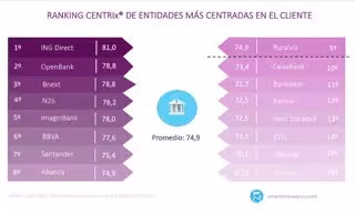 Los neobancos, nacidos en el entorno digital, son los que tienen las valoraciones superiores en este ranking, liderado por ING, con una nota de 81 sobre 100, Openbank (78,8), Bnext (78,8), N26 (78,2) e ImagineBank (78). El 'top 10' lo cierran BBVA (77,6), Santander (75,4), Abanca (74,9), Ruralvía (74,9) y CaixaBank (73,5).