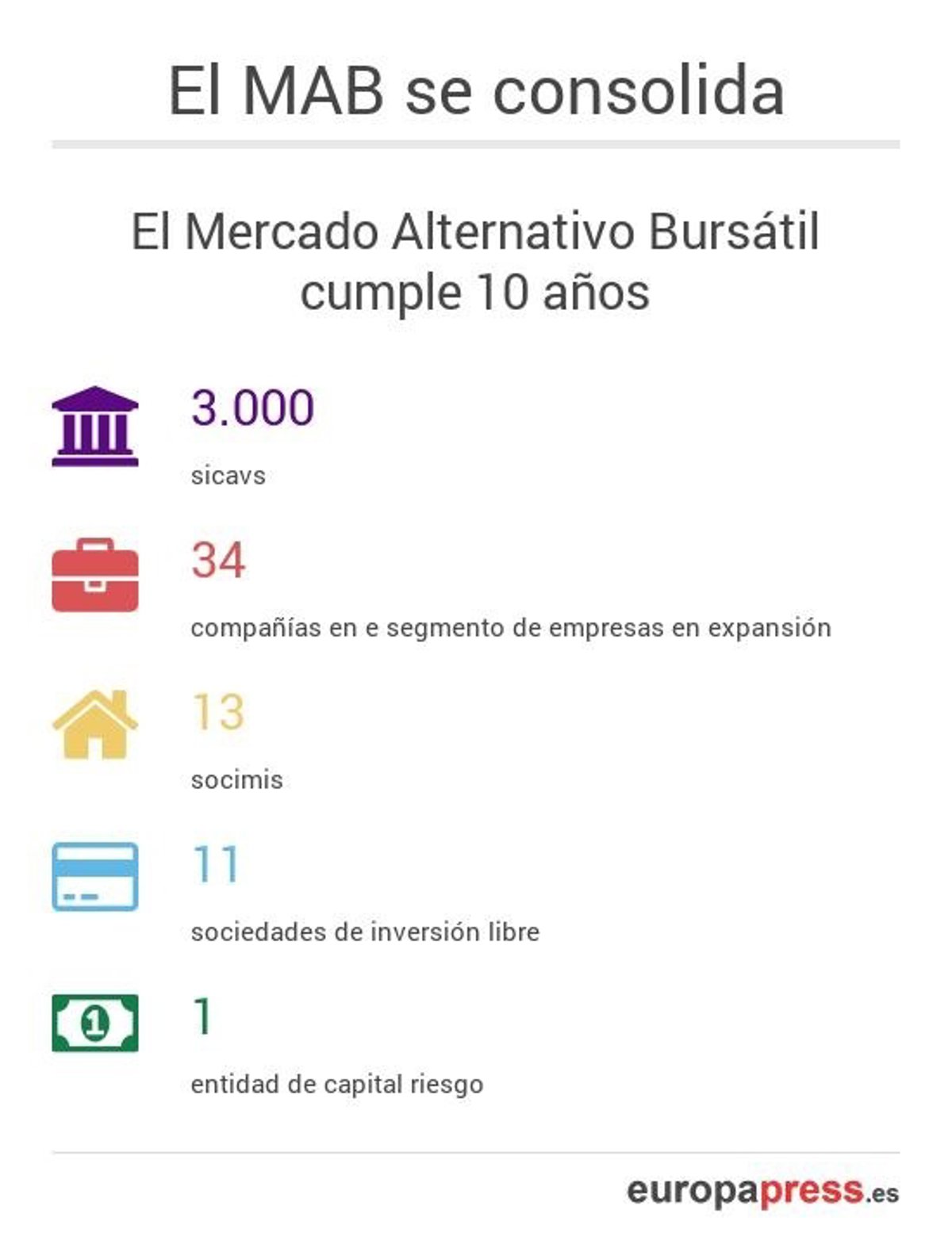 El Mercado Alternativo Bursátil (MAB) cumple este domingo diez años con más de 3.000 sicavs cotizando en él, 34 compañías en el segmento de empresas en expansión, 13 socimis, 11 sociedades de inversión libre y una entidad de capital riesgo.