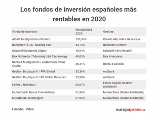 Por su parte, el octavo fondo que más rentabilidad ofreció a los inversores españoles es 'Esfera Robotics I', con un 32,07% en el año 2020, algo inferior a la obtenida en 2019, cuando también fue uno de los diez fondos del país que más ganaron, con un 37,36%.