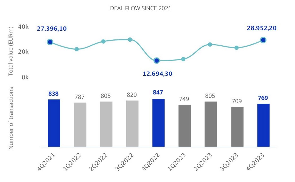 En términos sectoriales, el sector inmobiliario ha sido el más activo del año, con un total de 663 transacciones, pese a que ha registrado un descenso del 1% respecto a 2022, y le ha seguido el sector de internet, software y servicios, con 379 transacciones y un aumento del 1% en tasa interanual.