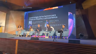 Desarrollo de la mesa “La estrategia de los bancos para Cripto en España y Latinoamérica” durante The Merge, en Madrid, a 8 de octubre de 2025. - MERGE MADRID