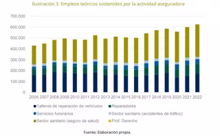 Del total de empleos resultante, cerca de 300.000 serían profesionales sanitarios que prestan sus servicios por acuerdos con aseguradoras de salud. A estos, se sumarían 21.000 profesionales de la salud sufragados por los pagos que realizan las aseguradoras de automóviles para atender a lesionados de tráfico, así como 175.000 empleados de talleres de reparación de vehículos, unos 88.000 reparadores del hogar y 43.000 personas que trabajan en servicios funerarios.