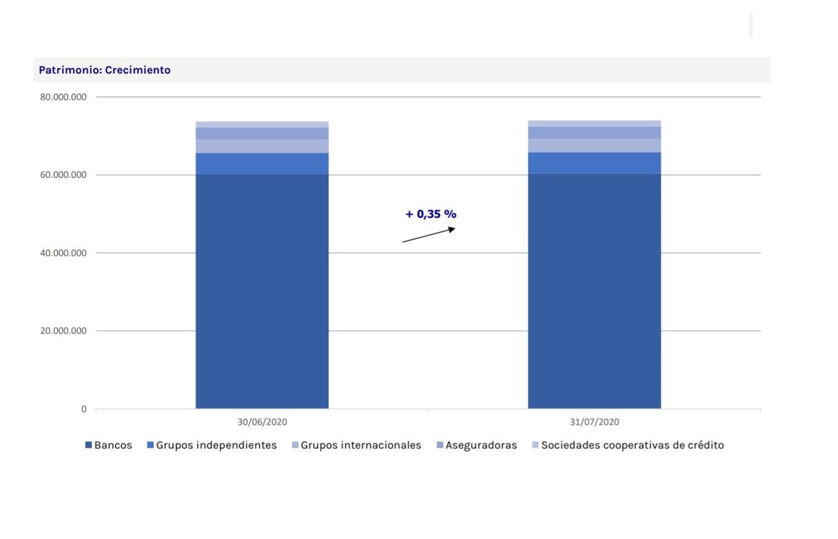 Los bancos registraron las mayores captaciones netas en el mes, con 34 millones de euros, seguidos de las entidades aseguradoras, con 12 millones. Ambos grupos elevaron su patrimonio en el mes un 0,42%. Las captaciones netas de los grupos independientes ascendieron a 3,2 millones, aunque su rendimiento negativo de 29,5 millones motivó que su patrimonio se redujese en un 0,48%.