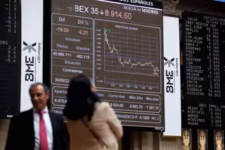 Dos personas frente a un panel de valores del Ibex 25 en el Palacio de la Bolsa, a 30 de mayo de 2022, en Madrid (España). El Ibex 35 ha retrocedido un 0,14 % en la media sesión de este lunes, hasta situarse en los 8.920, 9 puntos en una jornada marcada - Eduardo Parra - Europa Press